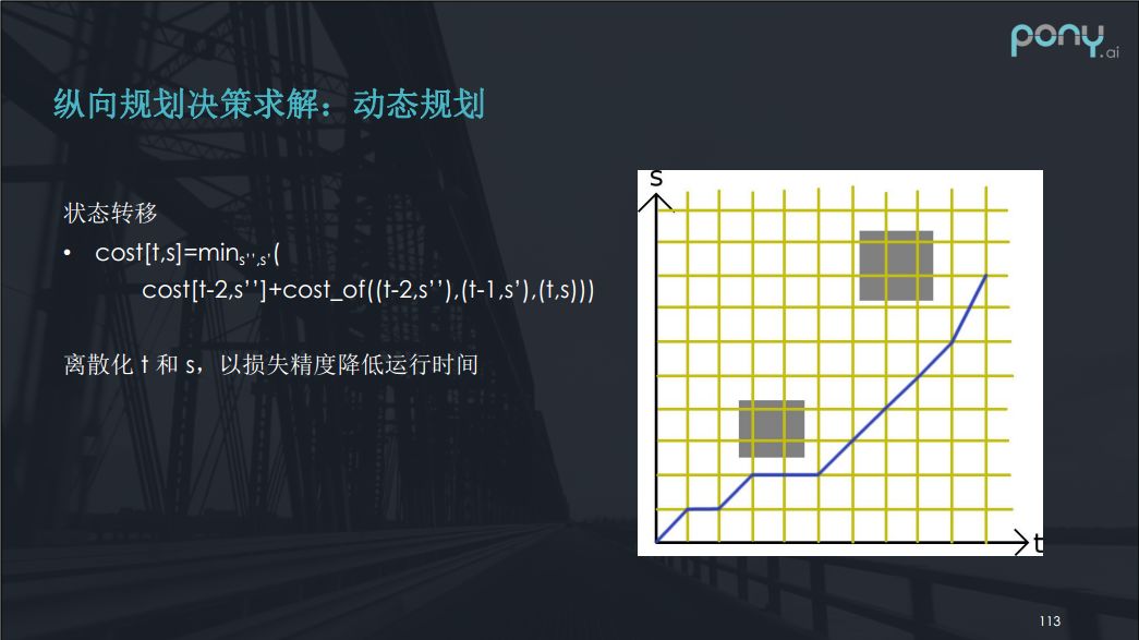 首先是纵向规划的决策,决策的方法我们已经谈到了一些,比如动态规划。这是一个NP-hard问题所以没有一个简单的算法进行精确求解。看下图,如果有两个人穿马路,我们来研究一下如何走才是最优的,我们可以将T-S进行离散化,离散化之后,我们就可作出一个状态转移方程,而这个状态转移方程我们可以看作每一步的决策只与前边的两步有关系,所以有转移方程。虽然这个方程在实际过程中比较难写但确实是一种做法。虽然离散化t和s降低了精度,但降低精度也能降低了运行时间。注意,这种方法并不能保证最后的速度比较舒适,它只是大概的一个决策方法,既到底让或者不让。