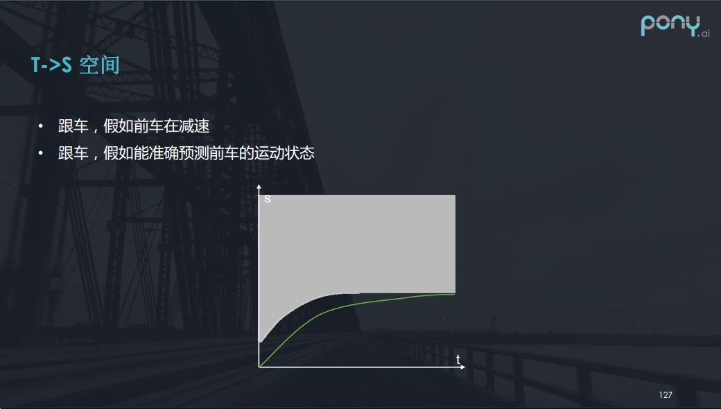 我们再看一些更高级的想法,我们在跟车的时候,假如前车在匀减速,在s - t,如下图所示,如果能够精确描述前车的运动的状态,那么白色部分会有各种各样的形状,这样就可以在解优化问题是解出一个好的速度曲线。