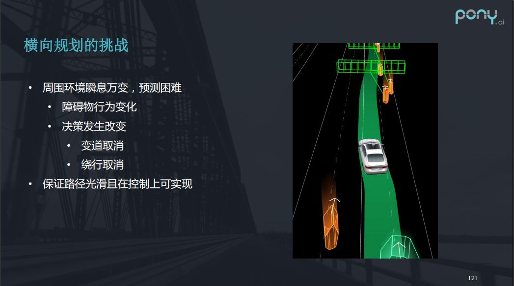 另外一些挑战就是环境的问题,因为周围的环境是瞬息万变的周围的环境预测也是困难的,我们看下图,本来车辆是要往左变道,而左下角黄色的块表示摩托车,这个摩托车正在飞速的过来,所以车辆又进行了取消变道的决策,也就是生成平滑的曲线回到原来的道路上去,这样的情况我如何能保证路径光滑且在控制上可实现,也是一件很难的事情。