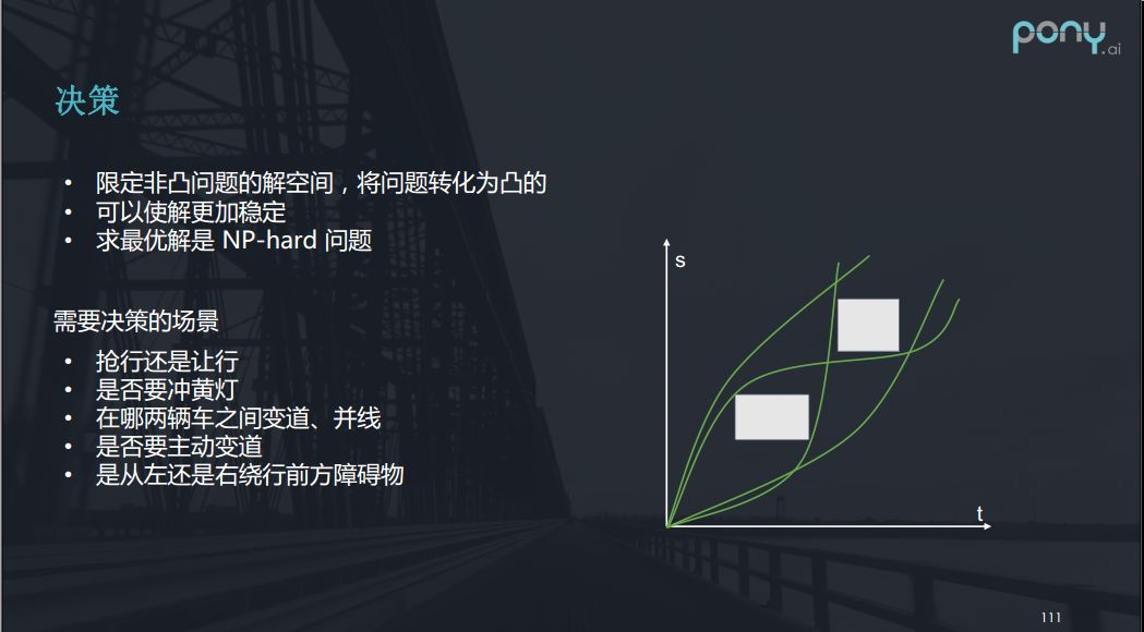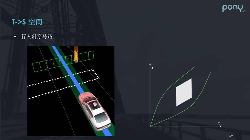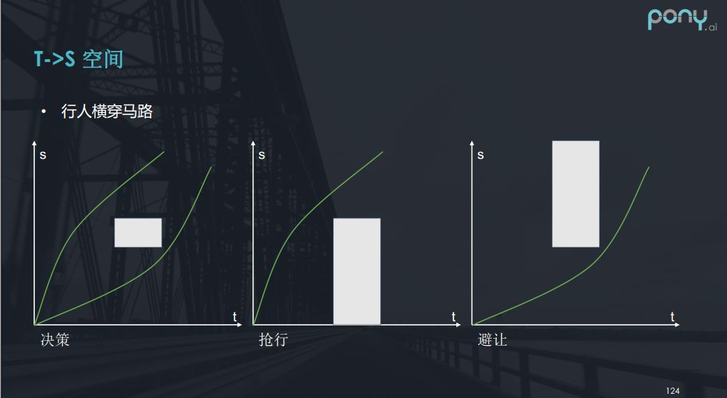我们举一些例子,前边提到了行人横穿马路,行人就是这样一个矩形,我们对应了两种决策,决策完成后我们应该怎么办呢?如果决定要抢行,我们就可以将矩形的约束条件扩展到最下部,这样就是凸问题求最优解。如果是避让我们就可从下边过,但是如果是行人斜着穿过马路呢?那么请大家想一下按s ->t图是如何表示的呢?答案就是它是斜向上的平行四边形。