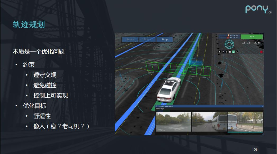 轨迹规划本质上来说是一个优化问题。谈到优化问题,我们需要知道优化的约束和优化的目标。首先看约束,第一个约束就是车辆要遵守交规,这是强制性的约束;第二个约束是要避免碰撞;第三个约束是要使规划的轨迹在控制上可实现,不能出现规划了一个急弯的轨迹,车根本拐不过来的状况。而优化的目标总的来说就是要跟人开的像,具体表现就是让人乘坐起来感到舒适。但像人也有不同的优化目标,比如我们可以开的稳一点也可以开的急一点,像老司机一点。