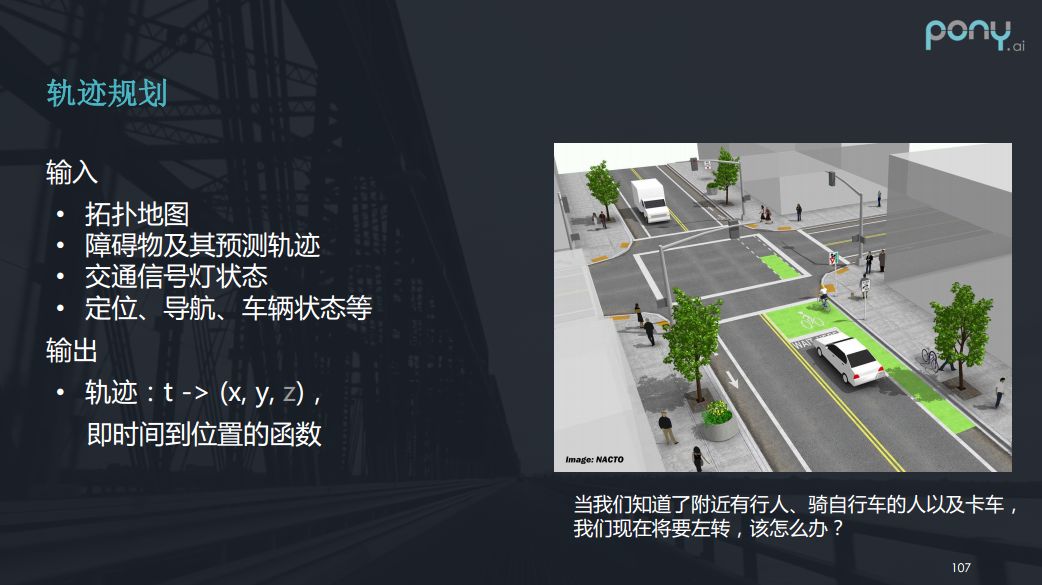 轨迹规划的输入包括拓扑地图,障碍物及障碍物的预测轨迹,交通信号灯的状态,还有定位导航(因为要知道目的地是哪才能规划路径)、车辆状态等其他信息。而轨迹规划的输出就是一个轨迹,轨迹是一个时间到位置的函数,就是在特定的时刻车辆在特定的位置上。在PPT上是t ->(x,y,z),把z标灰是因为目前为止我们的车不会飞。