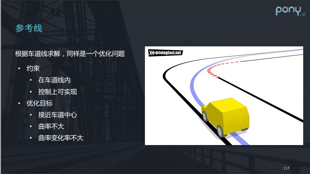 对于参考线的生成,很类似于开卡丁车时别人教你的过弯的最优路线,它也是一个优化问题,当然也要保证安全性和舒适性,但是方便的是有了地图以后我们是可以离线去做的,所以可以用一些开销比较大的算法做到非常优。它的约束是在车道线内,且控制上要可实现。优化目标就要接近车道中心,曲率不能太大且曲率变化率不大。