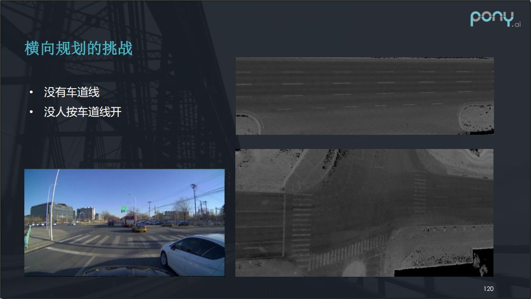 之后我们再来看看横向规划的挑战。虽然大部分时候车都在一个有车道线的地方开,但比如像下图左下部分的路口,这边是三条直行的车道,而对面是四条条直行的车道,右边的白车就不会按车道线开,会横跨车道线挤你。右上的图,是有辅路的情况,他是没有车道线的,这种进辅路的问题更像是一种没有参考线的freespace的规划,这种都是比较大的挑战,如果说没有车道线或者说没有人按车道线开,那么这样的规划就会比较难做一点。