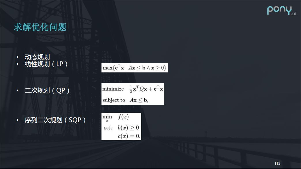 正是因为轨迹规划是非凸的,所以我们需要用决策的模块来解决。什么是决策呢?从数学上来讲,决策就是限定非凸问题的解空间,将问题转化为凸的。我们可以看下图的例子,如果两个人在穿马路的话,我们大体上可以有四种不同的决策,既让两个人,超两个人,让一超一和超一让一。而一旦决策确定,那么其实就可转换为凸的问题,求解就会相对来说比较容易。决策也会使解更加稳定,因为一个单纯的数值优化问题的求解,会很难保证每一帧的解是相对稳定的,不会出现第一帧要让,而第二帧却要冲的问题。但需要注意决策的问题是一个NP-hard 问题。有一些需要决策的场景,比如抢行还是让行,是否要冲黄灯,在哪两辆车之间变道、并线,是否要主动变道,是从左还是右绕行前方障碍物,只有做了决策才能使问题变为凸优化问题,便于求解。对于凸问题,有很多比较快速的算法进行计算了。线性规划,二次规划,序列二次规划,都是数值求解优化问题的方式。我们可以看一下二次规划中,如果Q正定,二次规划就是凸的问题,有很快的方式求解它。