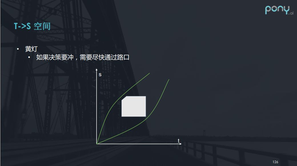 再看一些类似的例子,如下图。比如黄灯,黄灯是一个特殊的例子,如果决策要冲的话,需要尽快通过路口,否则的话很容易被逼停在路中间出不去,这种情况我们可以用一个这样的s - t图表示,左边界是表示黄灯亮的时刻,大家看这样的白色矩形有一个缺角,当黄灯亮起的时候,我们如果要尽快通过路口,t在增大的过程中s也要尽快的增大,增大的速率要超过缺角的斜率。