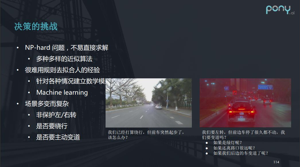 我们再来看一下决策方面的挑战。第一个挑战上面已经讲过了,决策问题是一个NP-hard问题,不易直接求解,有多种多样的近似算法。第二个挑战是很难用规则去拟合人的经验,包括上述的状态转移方程中的cost也很难去表示。而一些解决的办法是我们可以根据各种不同的情况去建立一个数学模型。以及用机器学习的方法去做一些决策。比如说下图左边的例子,我们已经打算绕行,但前车突然起步了,我们该怎么办?我们是该变道还是跟在后边走还是继续绕行?这种情况确实很靠人的经验。再看右边的图,我们要左转,但是前边这辆车停了很久也没有走我们要不要变道呢?作为人类司机也很难判断。场景的多变而复杂使得决策面临着很多挑战。