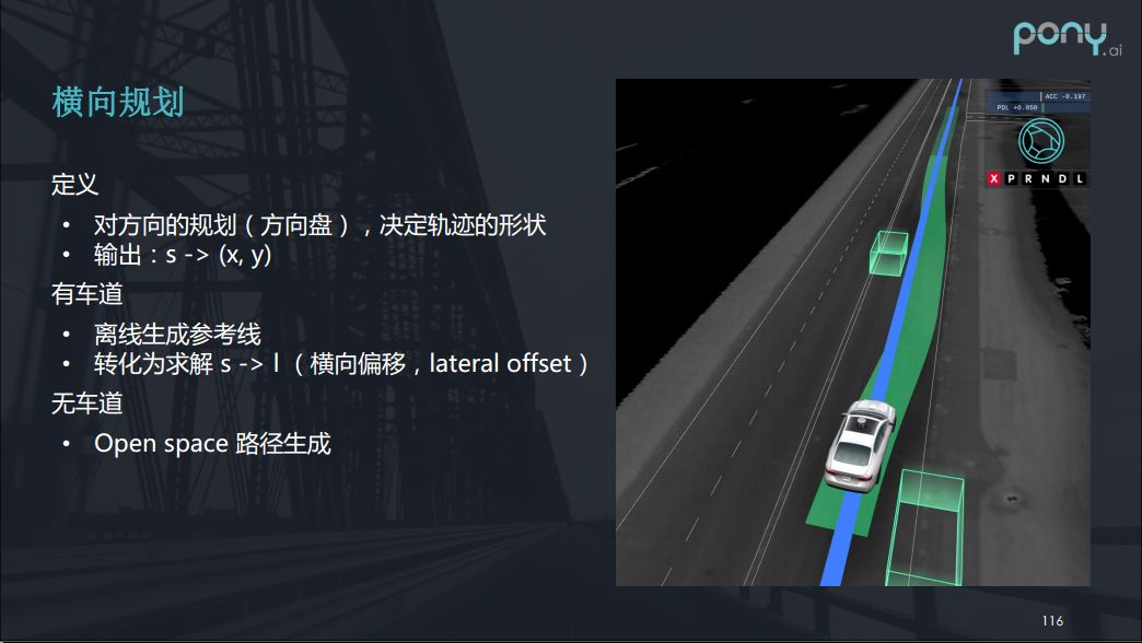 刚刚我们已经说过了,轨迹规划可以拆成横向和纵向的规划。横向规划是一个方向的规划,它可以看成一个如何打方向盘的规划,它只决定了轨迹的形状。这个问题通常的解法分两种,一种是无车道的,比如说freespace中的规划,或者说是停车之类的问题,它是没有车道线信息或者说先验信息的,大多都用OpenSpace路径生成的方式去做,一般也是低速的。对于有车道的情况,虽然有车道线但是输出s ->(x,y)这个函数难度也是比较大的,常见的做法是是离线生成参考线,之后我们就可以将s ->(x,y)这个问题变为一个求解s ->L的问题,L是指车辆在这个参考线上的横向偏移量。可以看到下图右边这张图,本来是沿车道往前走,但由于有车辆的遮挡,我们就必须绕行它。即横向偏移就可以了。