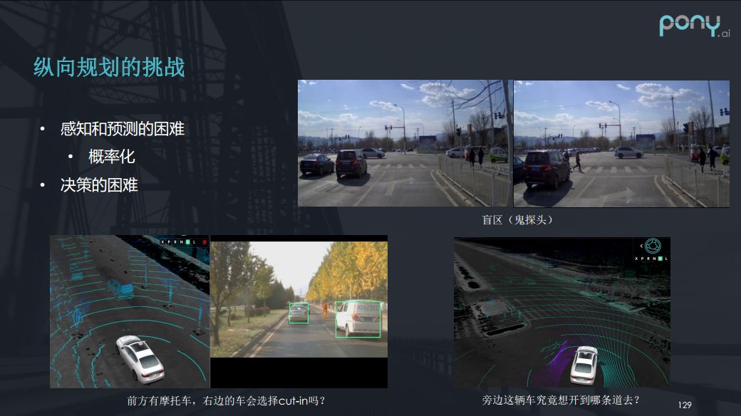 另一方面,感知和预测带来的困难也会带来纵向规划的挑战,可以看下边这连续两张图,突然就有人从车前冲出来了,这个我们俗称叫做鬼探头,你要检测到有盲区,需要在在检测到有盲区的时候进行减速等等。还有问题就是预测,我们可以看到左下角的图,右车道有一个面包车,而前边有速度慢的一辆自行车,人一看就知道,这个面包车极有可能变道,但这对预测也提出了很大的挑战,如果没有预测那么你的反应就会比较慢。右下角的图,你也无法判断这辆左拐的车要拐到哪条车道上去。