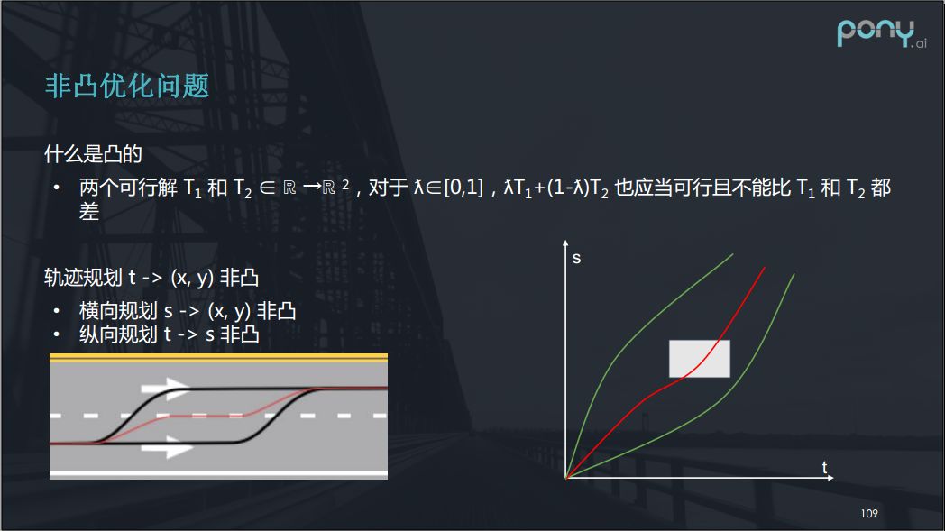 我们再来看纵向规划,我们经常用t - s图表示。t表示时间,s表示我们走过的路程。当一个人横穿马路时我们可以用白色矩形来在t - s图上表示这个过程,左边界表示人进入我们规划路径的时刻,右边界表示离开规划路径的时刻。横向上,上下边界差可以理解为人在占用我们规划路径的宽度。对于这样一个纵向规划,有两种选择,一种是我们要让人,既下边的绿色路线,一种是车辆加速超过,既上边的绿色路线。但它的线性组合可能是这条红线,明显这已经撞上了,所以这并不是一个凸的问题。