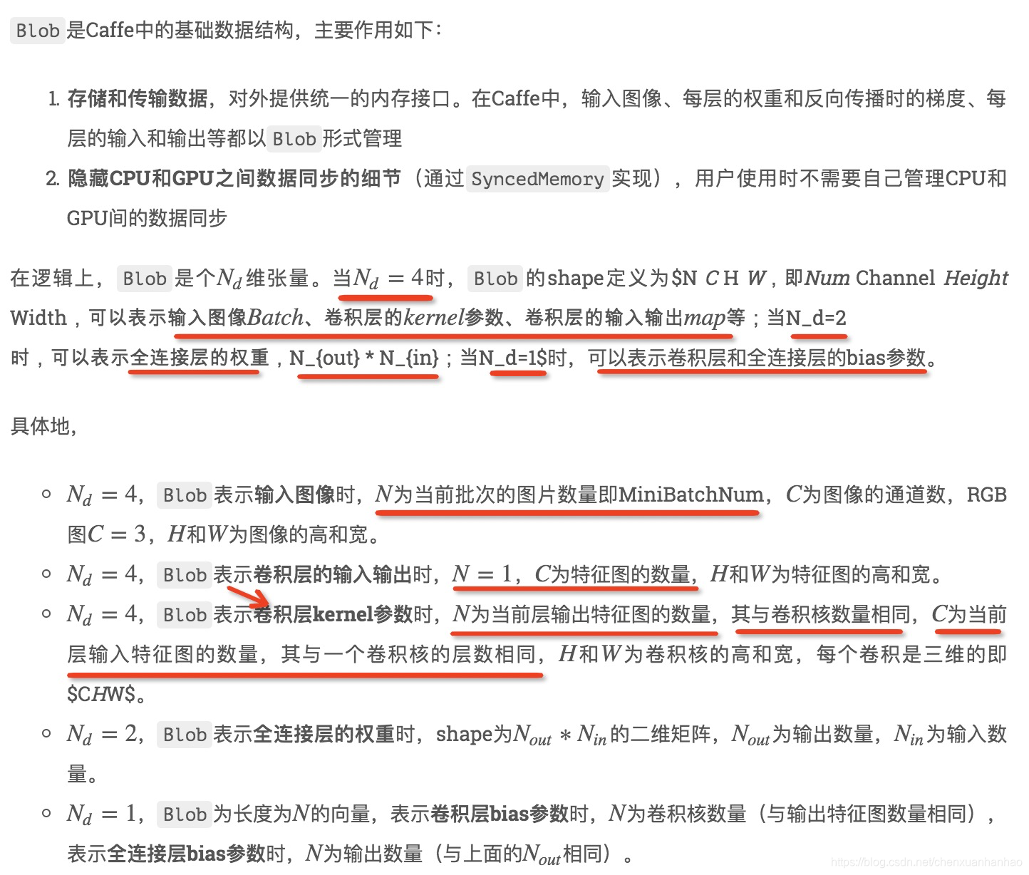 Nd=4,Blob表示卷积层kernel参数时,N为当前层输出特征图的数量,其与卷积核数量相同,C为当前层输入特征图的数量,其与一个卷积核的层数相同,H和W为卷积核的高和宽,每个卷积是三维的即$CHW$。
