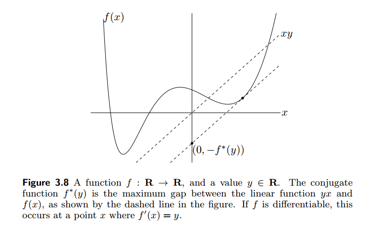 的共轭函数(conjugate function),不了解这个定义intuition的同学可以看一下下图这张非常直观的解释(图来自Stephen Boyd的那本凸优化)。共轭函数有很多很有趣的性质,比如如果f是convex且closed的(closed表示它的epigraph是闭的)那么