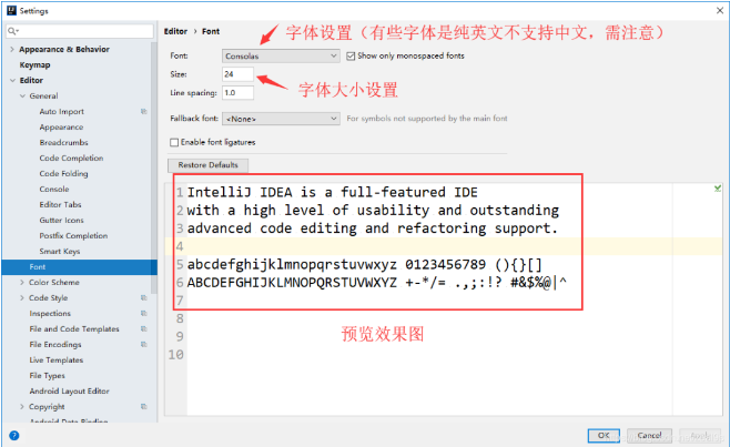 (2)设置方法File–>settings–>Editor–>Font–>