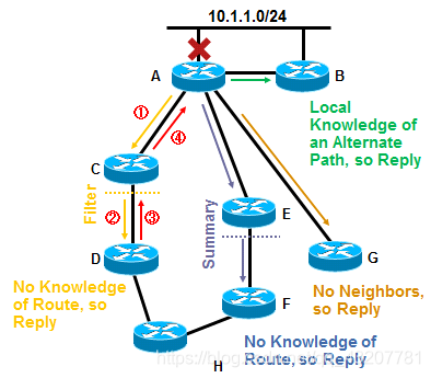 4. 当查询到有更好的路由时,如Router B有到达10.1.1.0/24的路由,会回复可达报文给Router A。