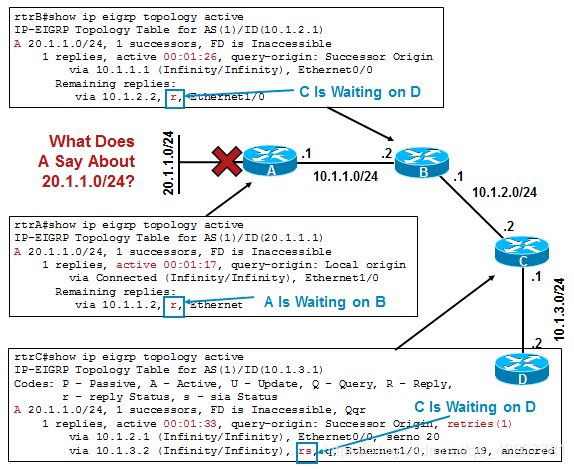 在处理SIA时,常会用到“show ip eigrp topolo active”,过程如图: