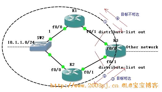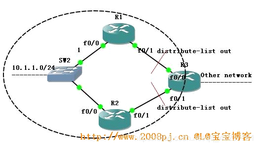 1.R3在f0/0和f0/1上应用distribute-list,目的是让R3只向左边区域宣告Other network