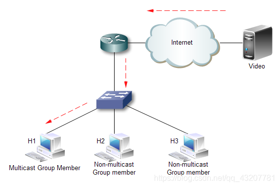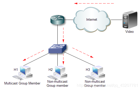 没有运行igmp snooping时,组播报文将在二层广播,如图3-1所示。