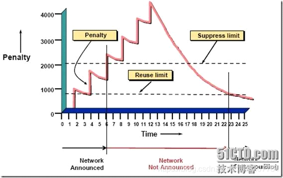 -惩罚值(penalty)---路由每flaping一次,这个惩罚值就会增加。默认的路由flaping惩罚值为1000。如果只有路由属性发生了变化,那么惩罚值为500。这个值是硬件编码的。