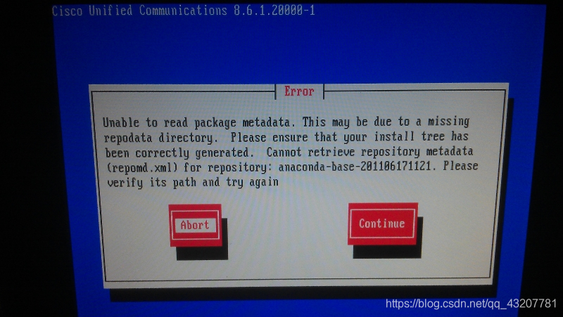 提示光盘的metadata信息出错,上网搜索了一下发现很多人装linux都有这个问题,大概是安装目录里存在其他的IOS文件导致出错的。但是这个光盘我拿来装CUCM是好好的。没有办法我就重新刻录了一张,最后成功安装。