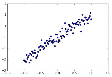 import numpy as np //#Aimport matplotlib.pyplot as plt //#B x_train = np.linspace(-1, 1, 101) //#C y_train = 2 * x_train + np.random.randn(*x_train.shape) * 0.33 //#D plt.scatter(x_train, y_train) //#E plt.show() //#E