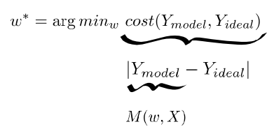 图 6. 无论哪个参数 w,最优的成本函数值都是最小的。成本函数的定义是真实值与模型响应之间的误差的范数(norm,可以是 2 次方、绝对值、3 次方……)。最后,响应值由模型的函数计算得出。