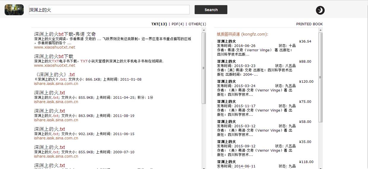 比如搜索弗诺·文奇老爷子的代表作《深渊上的火》,可以看到电子书的资源点在哪个网站,还可选择文件格式。
