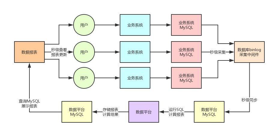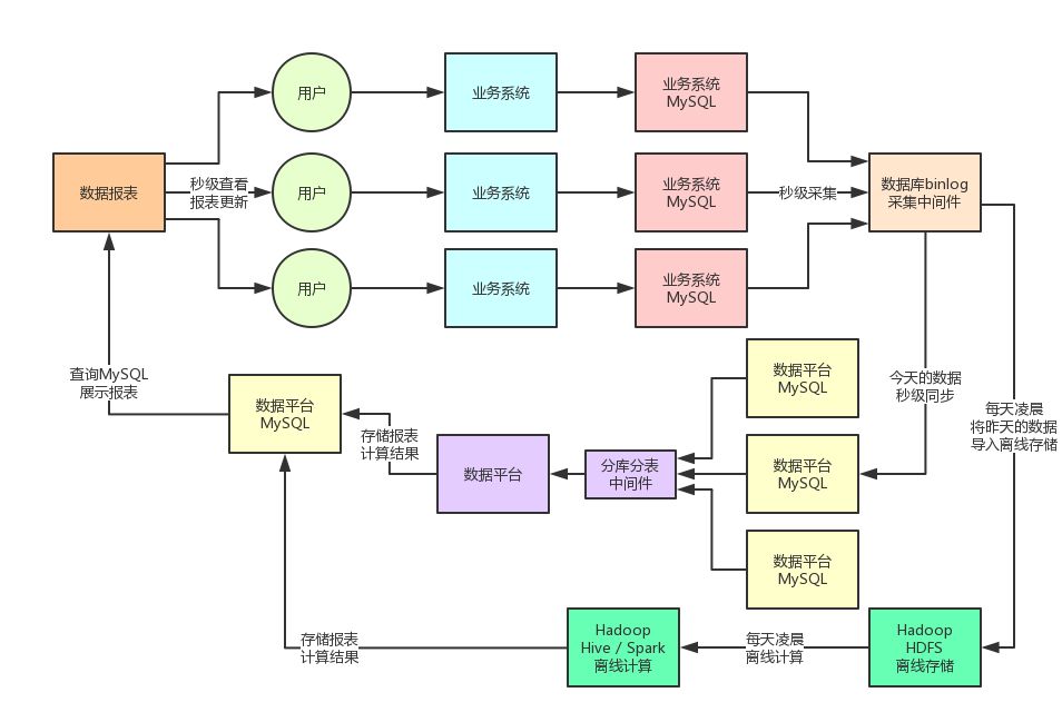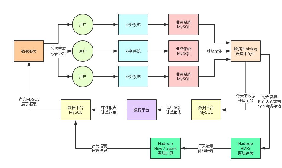 看整个过程,似乎数据平台只要想个办法把业务系统的数据采集过来,接着放在MySQL的各种表里,直接咔嚓一下运行100多个几百行的大SQL,然后SQL运行结果再写到另外一些MySQL的表里作为报表数据,接着用户直接点击报表页面查询MySQL里的报表数据,就可以了!