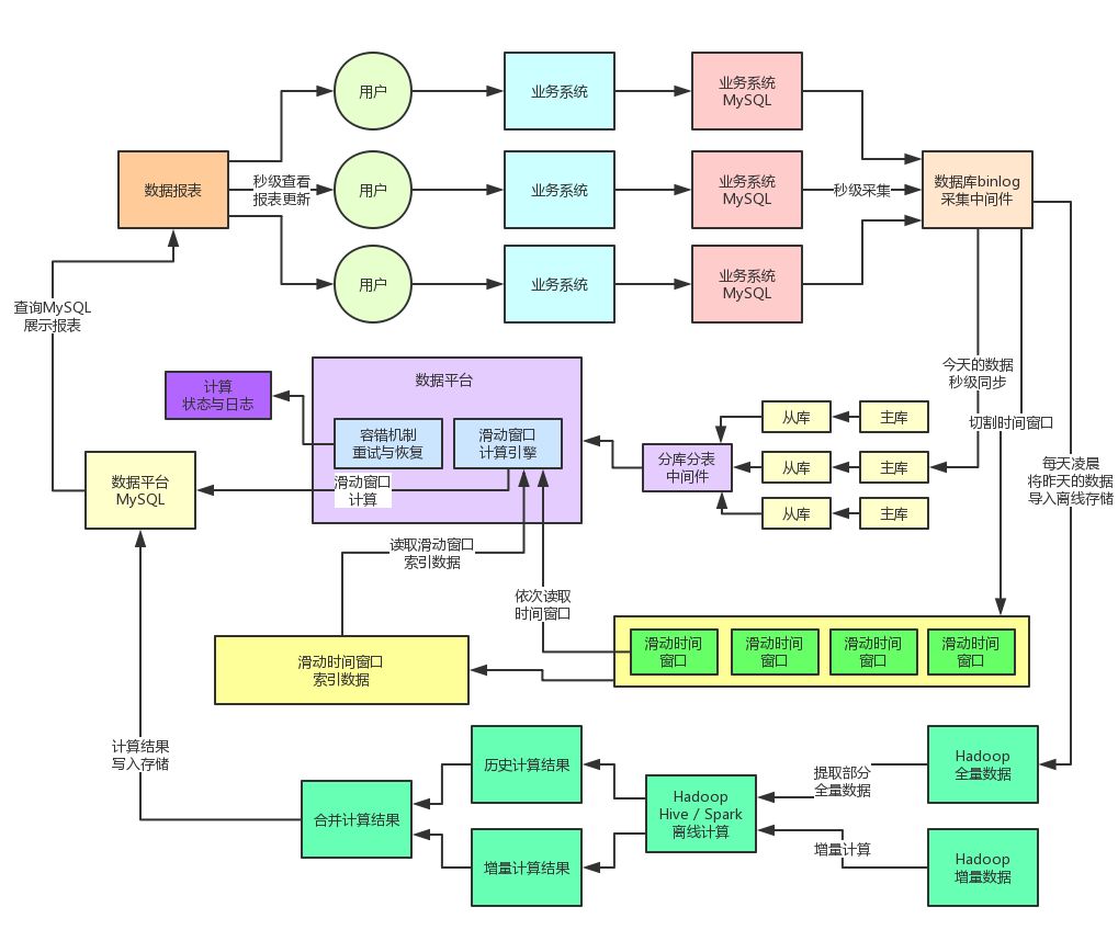 最后实时与离线的计算结果在同一个MySQL数据库中融合,此时用户如果对业务系统做出操作,实时数据报表在几秒后就会刷新,如果要看昨天以前的数据可以随时选择时间范围查看即可,暂时性是满足了业务的需求。