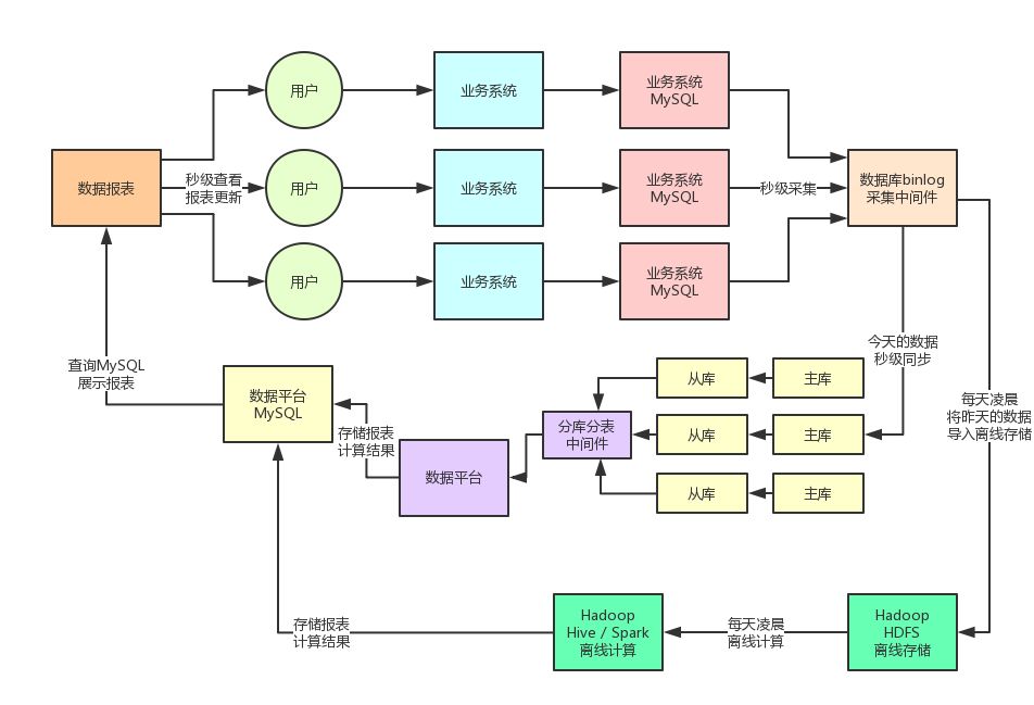一条是离线计算链路:每天凌晨,我们将业务系统MySQL库中的昨天以前的数据,作为离线数据导入Hadoop HDFS中进行离线存储,然后凌晨就基于Hive / Spark对离线存储中的数据进行离线计算。