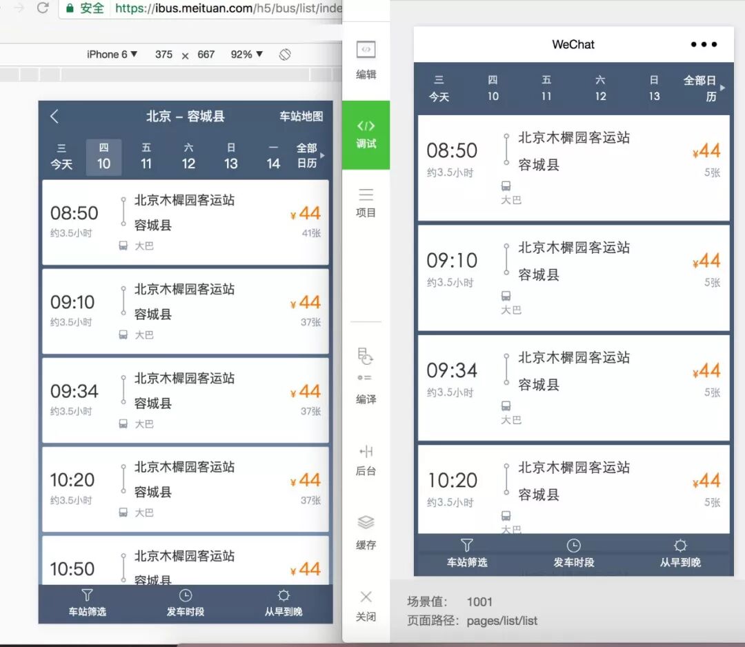 针对小程序开发中常见的两类代码复用场景,mpvue 框架为开发者提供了解决思路和技术支持,开发者只需要在此指导下进行项目配置和改造。我们内部实践了一个将 H5 转换为小程序的项目,下图为使用 mpvue 框架的转换效果: