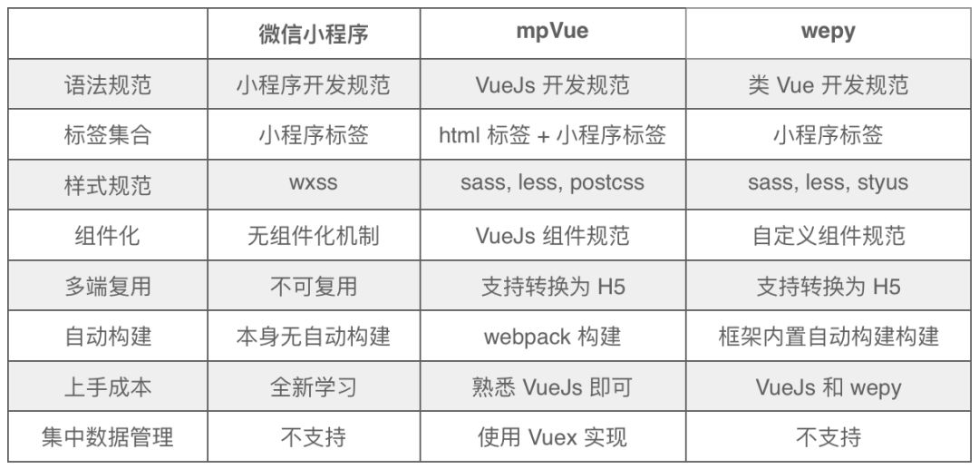 在表2中,我们对微信小程序、mpvue、WePY 这三个开发框架的主要能力和特点做了横向对比,帮助大家了解不同框架的侧重点,结合业务场景和开发习惯,确定技术方案。对于如何更好地使用 mpvue 进行小程序开发,我们总结了一些最佳实践。