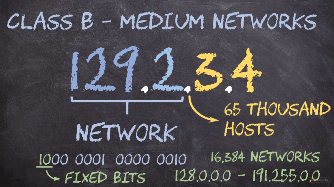 B 类网络适用于中等数量主机的情况,前两个八位位组用于网络空间划分,后面两个则用于主机地址划分,网络的前两个位始终为 1 和 0(10000000)即 128,可供我们设置的有 14 位,也就是 16384 个网络空间(2 的 14 次方=16384),其网络空间 IP 为 128.0.0.0 ~ 191.255.0.0,每个网络空间可以拥有 65536 台主机(2 的 16 次方=65536)。