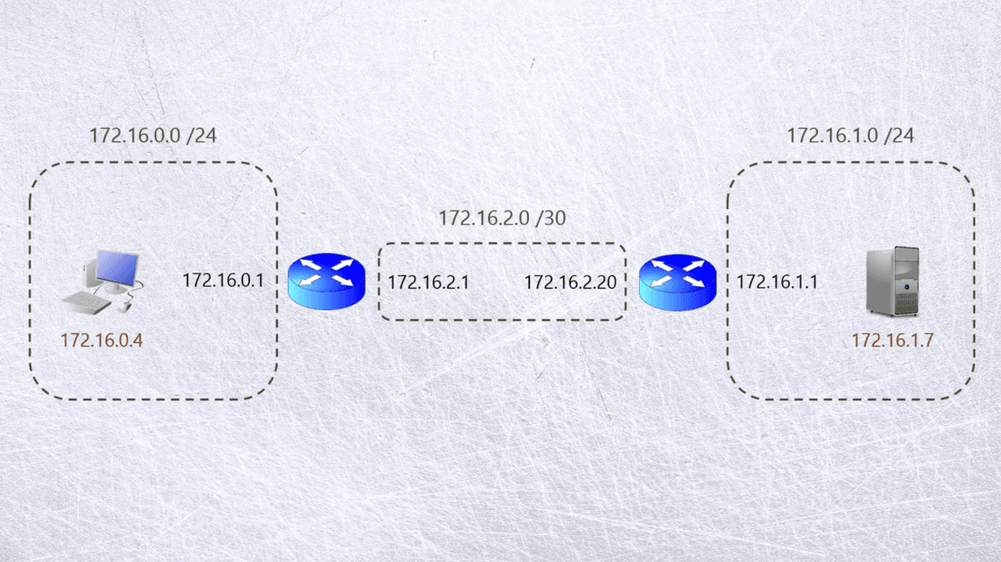 答:问题的重点在中间路由器所在的网段,通过 172.16.2.0/30 得知,八位位组的前30位都打开了,因此只留下 2 位允许划分空间,根据 2 的 2 次方=4 可以确定该网段之划分了 4 个 IP 地址 172.16.2.0~172.16.2.3。右侧的路由器 IP 为 172.16.2.20,很明显不在正确范围内。