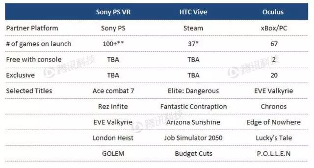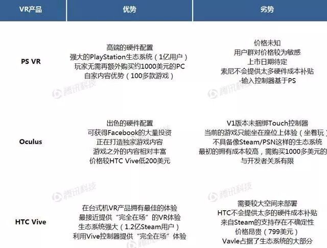 在三大主要VR系统中,硬件规范基本相似。基于不同的内容、开发者关系和投资能力,每家公司的竞争优势也有所不同。下面的图列出了三大台式机VR系统的优与劣。