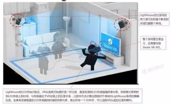 该系统包含一套Lighthouse定位系统,Lighthouse包含一组固定的LED和两个激光发射器。LED每秒闪烁60次,而激光发射器会不断发射光线扫描整个房间。VR头盔和控制器上的传感器能检测到这些闪烁和激光束。当检测到闪烁时,VR头盔开始像秒表一样计数,直至检测到LED传感器捕获激光束。接下来,利用激光束照射到LED传感上的时间,与传感器位于VR设备上的位置关系,以数学方法计算出其相对于房间内Lighthouse系统的精确位置。如果有足够数量的LED传感器同时捕捉到激光束,就会形成一个3D形状,可以追踪VR头盔的位置和朝向。
