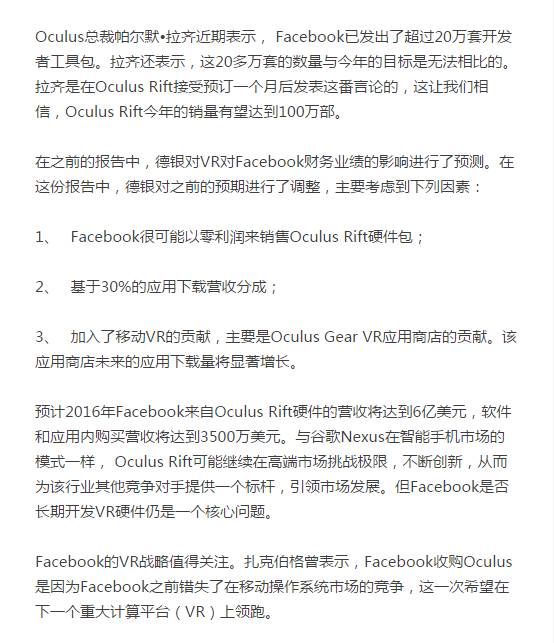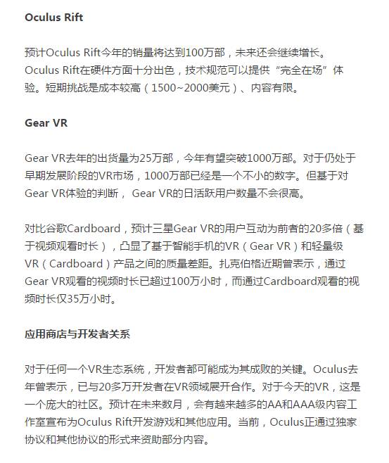 Oculus近期暗示,Oculus Rift的预订量远超出其已发出的开发者工具包(30万套),这意味着德银的预期(2016年售出100万部Oculus Rift)是合理的。德银认为,一些游戏玩家可能会选择HTC Vive,因为它上市时搭配动作控制器和Steam VR内容。但德银相信,Oculus Rift将拥有更大的用户群和开发者社区。Oculus应用商店采用“审核”模式,而非“开放”模式。