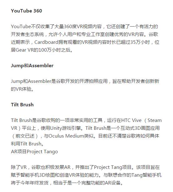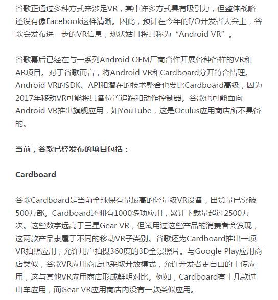 谷歌正积极投资于VR市场,在今年5月的I/O大会上,谷歌或将发布进一步的VR战略。在VR市场,谷歌已经准备就绪,包括Cardboard SDK、开发者、500万用户、YouTube 360和三维图像绘制工具Tilt Brush,以及拒绝将旗下主要应用置于Oculus应用商店中。