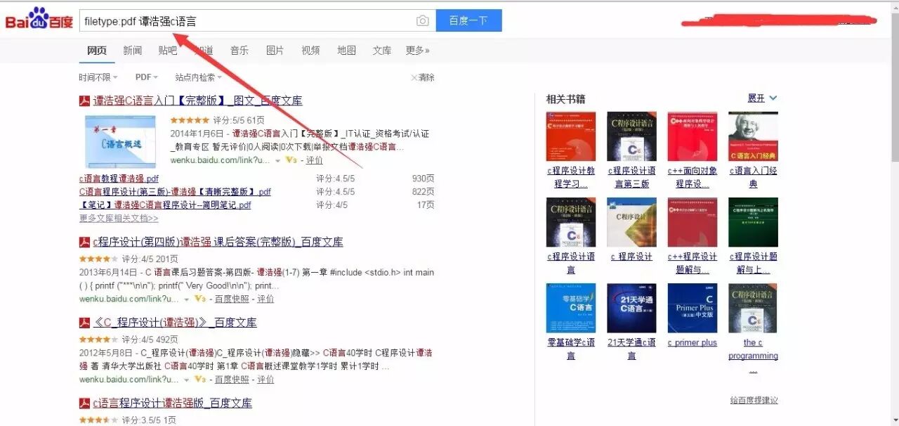 百度的文档搜索,也是这个命令: filetype:pdf 谭浩强C语言 ,不过相对谷歌而已,百度的搜索是把自己的产品,放在前面,见图,排在前面的都是百度自己的产品,百度文库