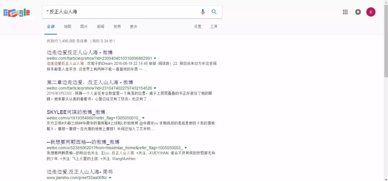 这也是一个比较常用的搜索方法,通常通配符搜索,用在模糊印象的地方比较多。当我想搜一句歌词,边走边爱,反正人山人海但是前边的边走边爱,就可以用这个方法进行搜索了。搜索* 反正人山人海