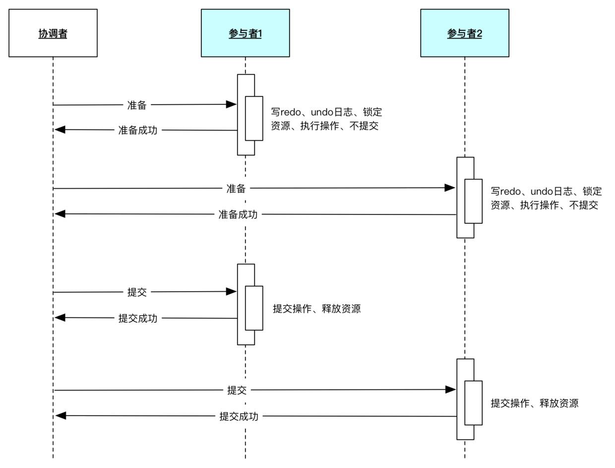 两阶段提交协议把分布式事务分成两个过程,一个是准备阶段,一个是提交阶段,准备阶段和提交阶段都是由事务管理器发起的,为了接下来讲解方便,我们把事务管理器称为协调者,把资管管理器称为参与者。