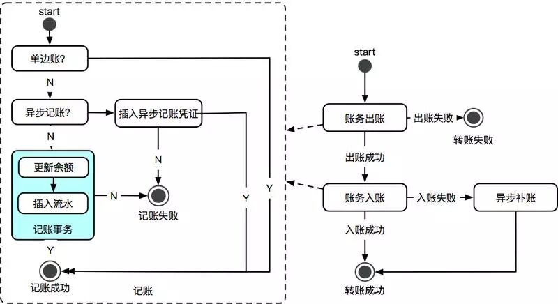 出账 & 入账 ,每个里面都做单边账、异步记账等处理,整个支付核心链路唯一的一个事务就在于更新账务余额 & 新增流水。