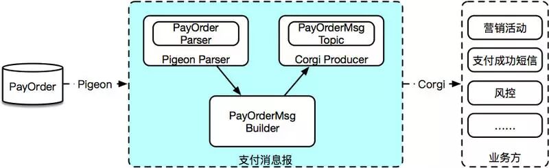 基于数据库事件中间件 Pigeon & 消息队列 Corgi,我们实现支付消息报。如图 1.2 所示,支付消息报基于交易核心数据,聚合支付核心的支付数据,最终生成支付消息报。通过这种方式,将原本需要在交易核心或者支付核心调用下游业务方,或者下游业务方实时查询的方式,转变为下游业务方通过接受消息的推送来获取数据,从而达到了业务的解耦。同时,也简化了业务方的数据获取复杂度。