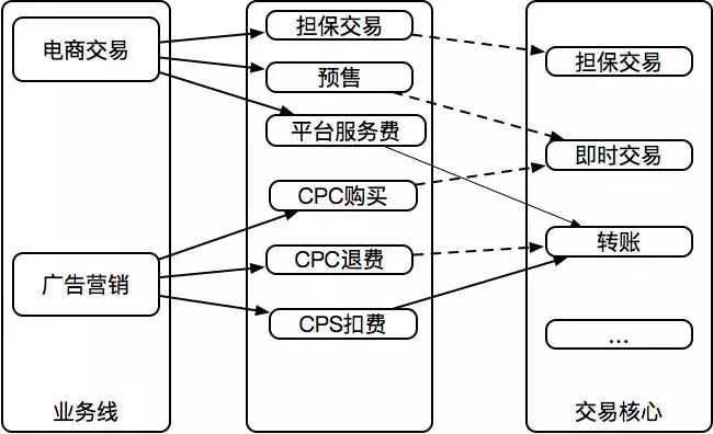 交易核心里面如何做基础交易类型的模型抽象?主要还是基于对支付的理解,如图 2.4 所示的例子中,电商交易的预售 和 广告营销的购买,都是从用户购买直接到收款方。那么我们可以抽象为即时交易,即直接从 a 用户到 b 用户的支付行为。