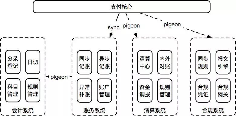 目前支付平台里,资金核算体系各个子系统:会计系统数据来源于账务系统,账务 、清算 、合规数据来源于支付核心。那么,需要在支付核心链路执行的时候同步调用账务 & 清算 & 合规,账务实时调用会计吗?其实基于对资金业务的分析,会计、清算、合规属于非强实时业务,可以通过数据变更中间件 Pigeon 同步数据,对这三个系统进行了解耦,如图:
