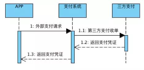 在外部支付中,经常会碰到这种情况,需要服务方与第三方支付交互,获取预支付凭证,如图 1.3 所示。这种同步调用的情况下,由于需要跨外部网络,响应的 RT 会非常长,可能会出现跨秒的情况。由于是同步调用,会阻塞整个支付链路。一旦 RT 很长且 QPS 比较大的情况下,服务会整体 hold 住,甚至会出现拒绝服务的情况。