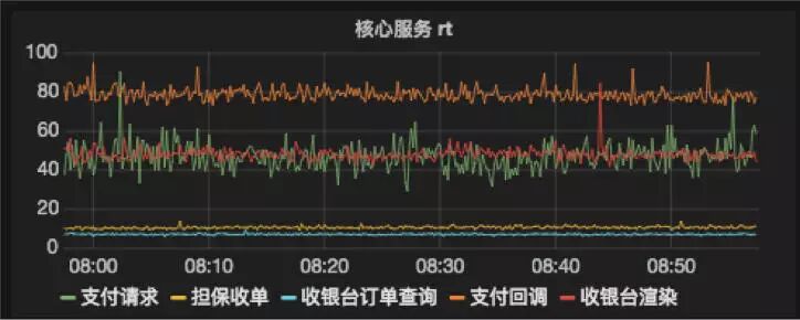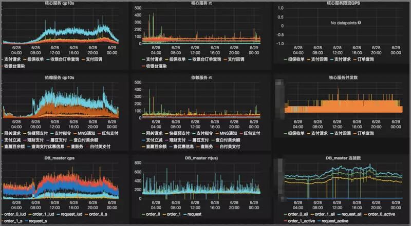如图所示,我们监控了核心链路的 qps、rt、并发量等,同时也基于支付核心,我们对依赖的服务 qps、rt 进行监控。另外,也对依赖的 DB & Cache 进行监控。