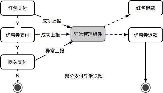 如图 2.8 以部分支付为例,我们做了一个异常管理组件来处理这种异常,在网关支付 + 红包 + 优惠券组合支付中,对每次的支付都进行上报。红包支付、优惠券支付,都成功上报,而对于网关支付异常时,也做异常上报机制。通过异常管理组件对部分支付成功的行为进行反向异常退款。