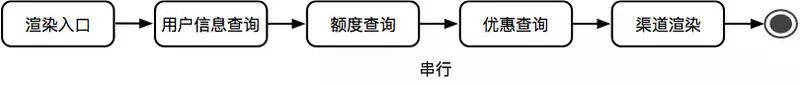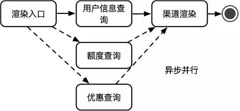 一次收银台渲染,串行的调用各个服务来进行用户信息查询 (RT T1)、额度查询 (RT T2)、优惠查询 (RT T3),最终执行渠道渲染 (RT T4),这种实现方式下