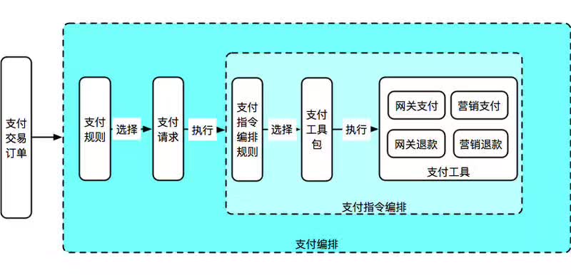 支付交易订单通过支付规则生成具体的支付请求(即支付核心记录),支付请求通过支付指令编排规则,获取一组支付工具包。通过支付执行器完成对支付工具的调用执行。这样的封装,我们可以实现插件式开发,以及可支付规则可配置化,继而让支付核心内部的支付工具互不影响 & 系统简化。整个编排过程如下图所示: