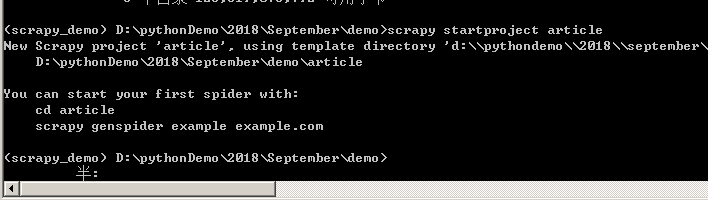 在我们创建好Scrapy爬虫项目之后,会得到上图中的提示,大意是让我们直接根据模板进行创建Scrapy项目。根据提示,我们首先运行“cd article”命令,意思是打开或者进入到article文件夹下,尔后执行命令“scrapy genspider jobbole blog.jobbole.com”,代表通过Scrapy中自带的basic模板进行创建Scrapy项目,如下图所示。